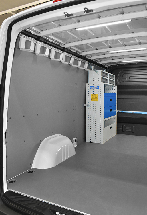 The original floor is protected by a plywood liner with a marble-look resin surface while the walls are lined with painted steel panels. On the left of the van, near the cab bulkhead, is a racking column made up of open and enclosed shelves and two rows of transparent pull-out containers. The rest of this side has been left free and is fitted only with a long section of slider bar with seven movable, telescopic hooks. There is more storage on the right of the van: trays for metal tool and component cases, metal drawers with non-slip mats and internal space dividers, two rows of transparent pull-out containers and two multi-purpose pockets on the side of the racking. Accessories like these can be installed and moved around at any time – directly by the customer – thanks to the equally spaced holes in Ultra racking.