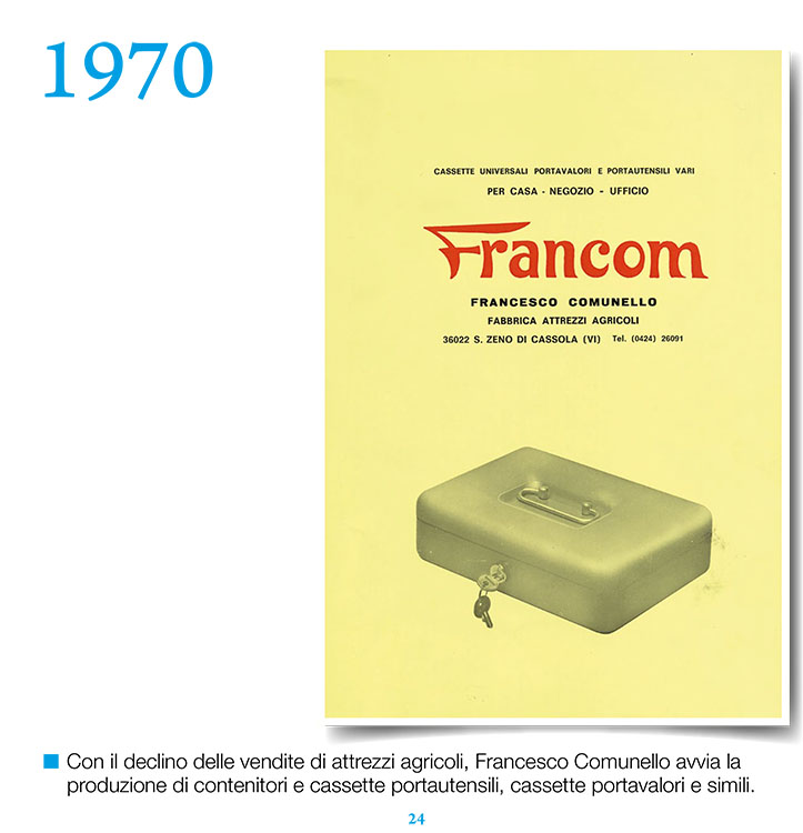 Continuous improvement has always been a key element in the Syncro Group’s business philosophy. Our founder, Francesco Comunello, was convinced of its importance. When he registered Francom back in 1960, he began writing a story of which we can now relate the first 60 years. Our company’s transformation from a small producer of farm implements to a large manufacturer and installer of van racking systems has been neither rapid nor easy, but the Comunello family has remained firmly in control despite all the challenges. Working together, they have ridden the waves of socio-economic change that have swept through Italy and the world, and have successfully exploited the many new technologies that have revolutionized the world of business.