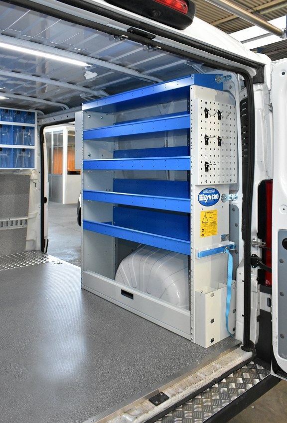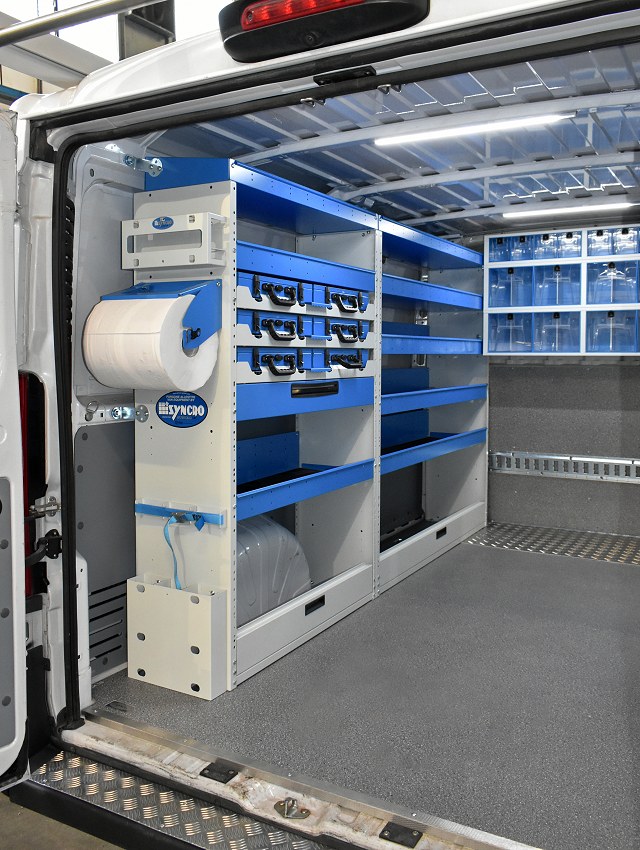 USA & Canada. The photos on this page show a van fitted out by Syncro North America for a heating engineer’s business. The installation you can see here incorporates some of Syncro’s most popular racking components including liners, drawers and shelves. It even includes custom solutions in response to requests by the customer who commissioned this particular mobile workshop.