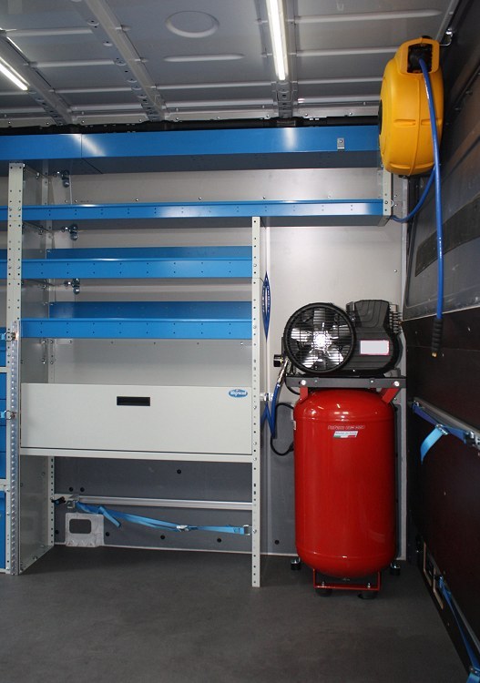 Practicality and autonomy are the two keywords of this racking system for a service engineer. The van operator needs to have everything to hand and also needs to be completely independent of external power sources, even for the most complex operations. To satisfy both these requirements, this side of the van is fitted with: